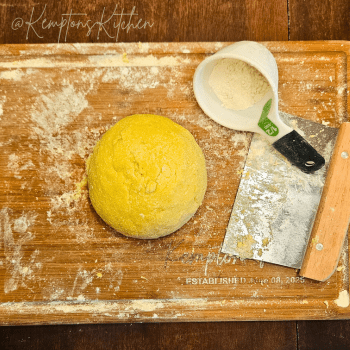 Once the dough has mostly formed, begin kneading by hand. It may seem dry at first, but it will come together with some patience. Knead for about 8–10 minutes until the dough is smooth, elastic, and slightly tacky but not sticky.
